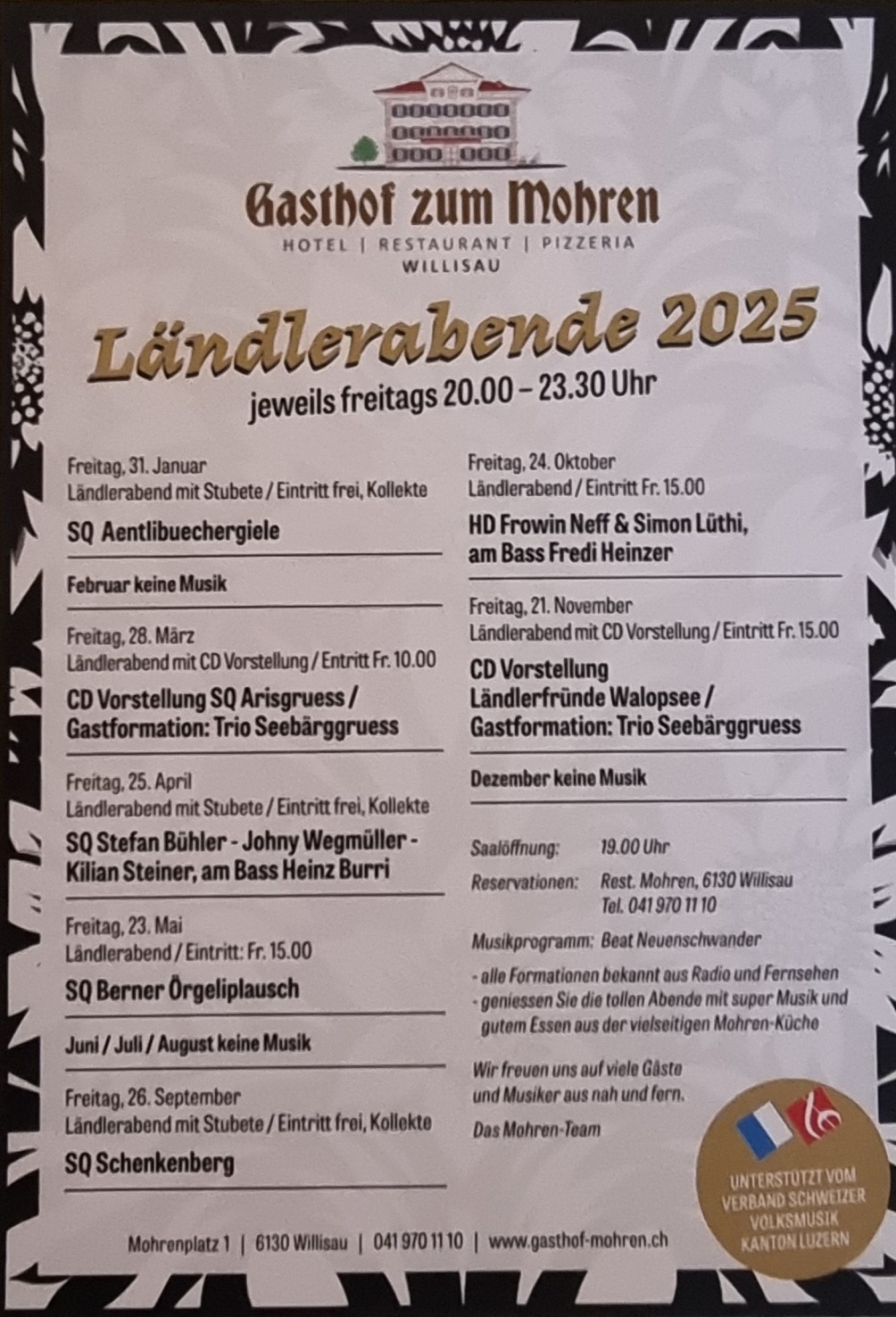 Nach dem ersten Jahr Ländlermusik im Gasthof Mohren Willisau können wir eine positive Bilanz ziehen. So hatten wir im Schnitt immer 50 - 70 Personen pro Abend. Vielen Dank an alle Gäste und Musikanten/innen aus nah und fern. Es beweist wenn man seriös organisiert und das Umfeld stimmt, kommen auch Besucher.